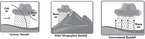 - When the warm air rises on the ‘front’ formed by the convergence of warm and cold air, it starts expanding. As a result, the air gets cold and finally rain is obtained by the process of condensation. This type of rain is called ‘cyclonic rain’ or ‘frontal rain’.