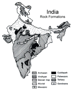 | Aryan rock System | Gondwana System Consists of sandstones with some shales and clays. Continental origin, fluvial and lacustrine deposits. Contains about 98% of coal reserves, iron ore, copper, uranium. Distribution: Peninsular region along Damodar valley in Jharkhand, Mahanadi river valley in Chhattisgarh and Odisha and also in southern part of Madhya Pradesh. Triassic System (280–225 MY old) It is almost absent in the Peninsula but is found extensively from Hazara to Nepal. The Deccan Traps From the end of the Cretaceous to the beginning of the Eocene volcanic eruptions undermined a large part of peninsular India. The volcanic deposits have flat summits and steep sides, making them appear as giant staircases from a distance. It is thickest along the west coast (3000m) and thinnest around the eastern limit(150m). Distribution: Kutch, Saurashtra, Maharashtra, Malwa Plateau, North Karnataka, parts of Telangana, Tamil Nadu, UP and Jharkhand. |