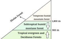 • The temperate moist mountain forests found on the Nilgiri, Annamalai and Palani hills are called ‘Sholas forests’. These forests are also found in the Satpura and Maikal ranges