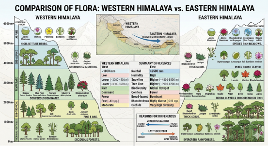 • Due to the higher average temperature of the Eastern Himalayas as compared to the Western Himalayas, all types of natural vegetation have expanded to higher heights. For example, in the Western Himalayas, coniferous and tundra vegetation is found at lower heights and in the mountainous regions above 4,000 meters, tundra vegetation cannot develop due to extremely low temperatures, whereas in the mountainous regions of the Eastern Himalayas, tundra vegetation has developed at an altitude of more than 4,000 meters.