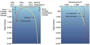 • Salinity, generally, increases with depth and there is a distinct zone called the halocline (compare this with thermocline), where salinity increases sharply.